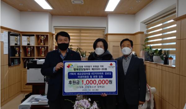 오산시 신장동행정복지센터(동장 유영만)는 지난 22일 금암마을 휴먼시아 데시앙 6단지 아파트 경로당(금암마을 6단지 경로당) 이경자회장과 회원들이 신장동 관내 저소득 가정의 청소년을 위한 후원금 일백만원을 기탁했다고 밝혔다.