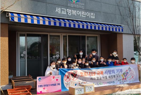 오산시 초평동행정복지센터(동장 임두빈)은 지난 21일 시립세교행복어린이집(원장 정경화)이 코로나19로 모두가 힘든 시기에 지역 주민들에게 작은 보탬이 되고자 아이들과 선생님들이 직접 제작한 허브 항균 버블 세정제 100개를 기탁했다고 밝혔다.