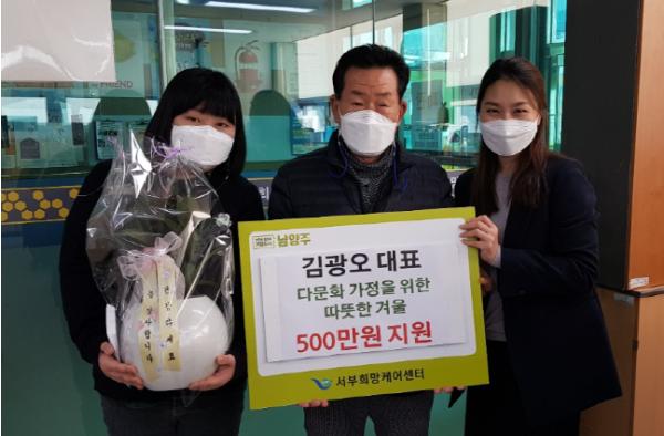 남양주시 서부희망케어센터는 다산동에 거주하는 김광오 후원자가 다문화가정 크리스마스 행사를 위한 사업비로 500만원을 기탁해 지난 23일 ‘다문화가족 송년 홈파티’를 진행했다.