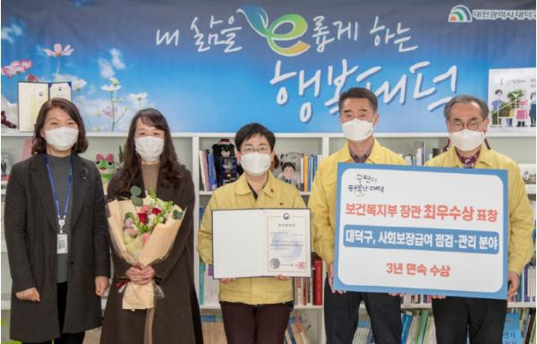 대전 대덕구는 보건복지부 주관 2020년 지역복지사업 ‘사회 보장급여 점검·관리부문’ 평가에서 최우수 기관으로 선정되는 영예를 안았다. 이는 2018년 대상, 2019년 최우수상에 이은 3년 연속 수상이다.