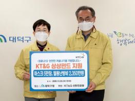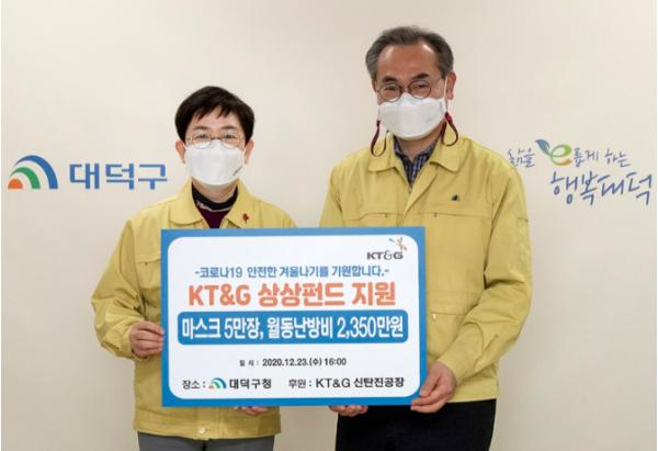 KT&G신탄진공장(공장장 김종철)에서는 지난 23일 동절기 어려움을 겪고 있는 난방취약계층과 저소득 노인 등을 위해 마스크 5만장과 월동지원비 2350만원을 대덕구(구청장 박정현)에 기탁했다.
