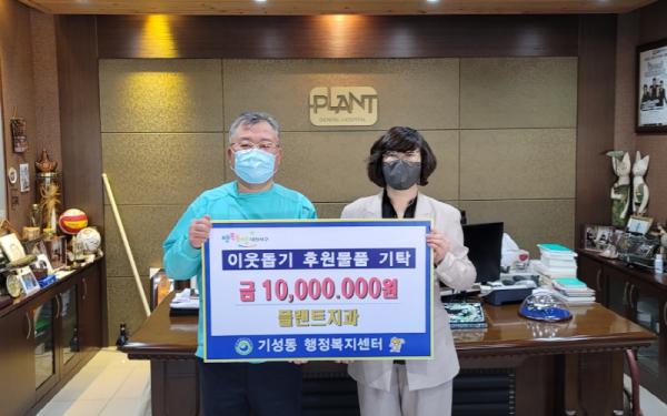 대전 서구 기성동 행정복지센터(동장 조희선)는 대전 유성구 소재 플랜트 치과(대표원장 손외수)로부터 어려운 이웃들에게 사용해 달라며 성금 1,000만 원을 전달받았다고 27일 밝혔다.