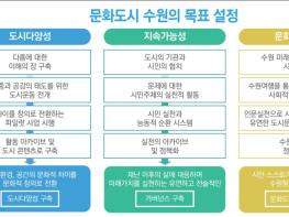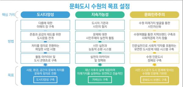 ‘문화도시 수원’의 핵심 가치는 ‘도시 다양성’, ‘지속 가능성’, ‘문화민주주의’이다. ▲사람·환경·공간의 문화적 차이를 ‘문화적 창의’로 전환해 도시다양성을 구축 ▲유연하고 전술적으로 미래가치를 실현하는 거버넌스 구축 ▲문화도시 브랜드 구축 등이 목표다.