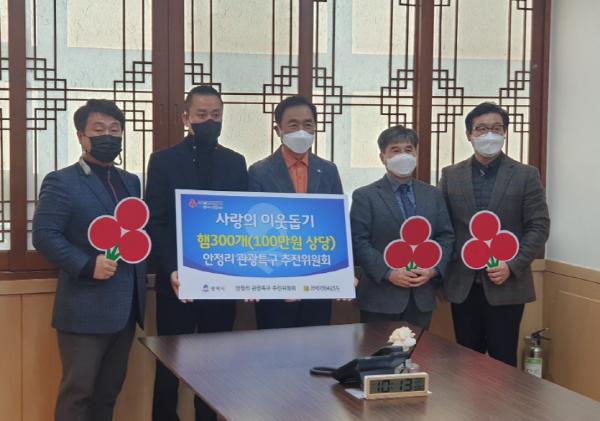 평택 팽성 (안정) 관광특구 추진위원회는 24일 평택시를 방문해 어려운 이웃을 위해 써 달라며 햄300개 기부 (100만원 상당) 기탁했다.