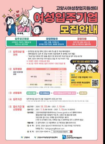 공고기간은 2020년 12월 22일부터 2021년 1월 13일까지이며, 신청서 접수기간은 2021년 1월 5일부터 1월 13일까지이다. 입주 신청서는 고양시여성창업지원센터 홈페이지 공지사항에서 서식을 내려 받아 고양시여성창업지원센터로 직접 방문접수하거나 이메일로 제출하면 된다.