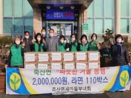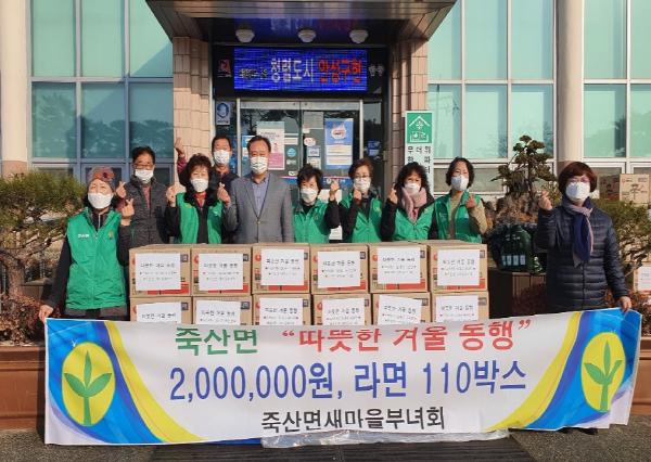 죽산면 새마을부녀회는 독거어르신을 위해 반찬 및 김장을 직접 만들어 전달해 왔으며, 이번에 연말을 맞아 부녀회원들이 십시일반 모은 회비 200만원과 라면 110박스 등을 기부했다.