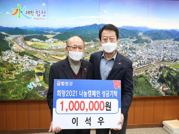 합천읍 이석우님이 28일 합천군청을 방문하여 이웃돕기 성금 기탁 1백만원을 기탁했다.