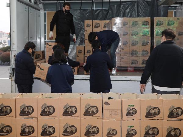 이번 행사는 겨울수박의 올해 첫 출하를 기념함과 동시에 코로나19장기화로 농산물 소비감소와 가격 하락으로 어려움을 겪고 있는 농가들에게 도움을 주고 함안수박 판매 활성화에 기여하고자 마련됐다.