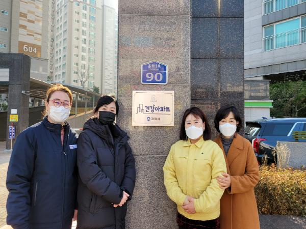지난 7월중 모집을 통하여 신청한 아파트 중 2개소(갑오마을 6단지 부영 아파트, 율상마을 모아미래도6단지아파트)를 선정하고 챌린지 등 시범운영을 통하여 12월에 건강아파트를 지정하는 현판을 전달하고 설치하였다.