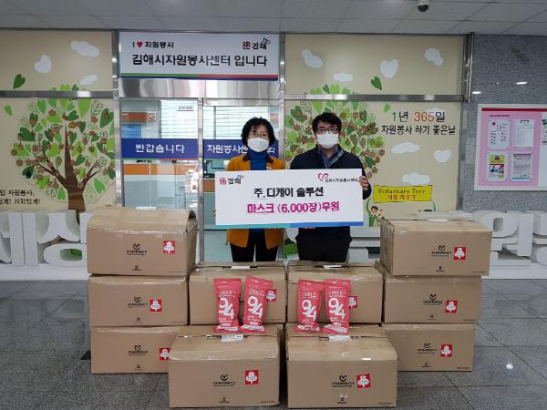 김해시자원봉사센터(센터장 박종주)와 (주)디케이솔루션(대표 김동규)은 지난 28일 관내 저소득 취약 가정을 위해 KF94마스크 6,000장을 지원했다.