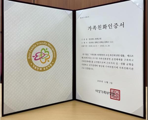 봉화군은 2017년 12월 최초 인증기관으로 선정되었으며 2020년 11월30일로 인증기간이 만료됨에 따라 올해 6월 연장승인 신청을 하여 서류심사 및 군수님 인터뷰 등의 현장심사를 거쳐 2022년 11월 30일까지 가족친화 인증기관의 자격을 유지하게 되었다.