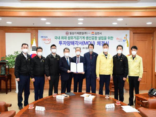 김천시는 28일 오후 3시 김천시청 접견실에서 김충섭 김천시장, 이우청 시의회 의장, 일성기계공업㈜ 김재영 대표 등이 참석한 가운데 필름가공용 기계 생산공장 설립을 위한 투자양해각서(MOU)를 체결했다.