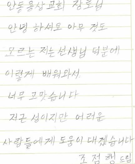2014년 늘푸른학교에 입학한 조점행 학생은 한글을 배우러 다니면서 선생님에 대한 감사의 뜻과 아들이 준 용돈을 성탄과 연말에 코로나로 어려움을 겪고 있는 불우한 이웃에 전하고 싶다는 뜻을 전해왔다.