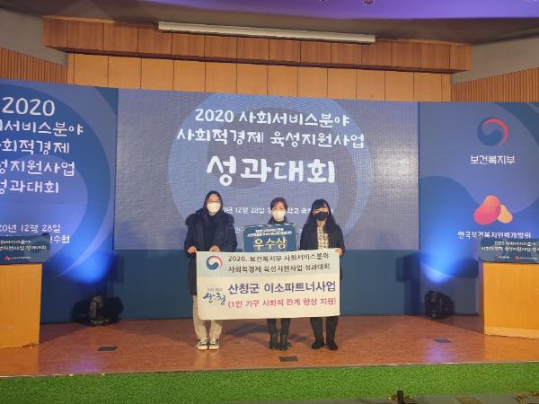 산청군은 1인 가구 수급자 비율이 높은 지역사회 문제를 해소하기 위한 세부적 계획수립과 국가 공적서비스 (지역사회서비스투자사업) 승인으로 지속 가능성 확보에 기여한 공로를 인정받았다.