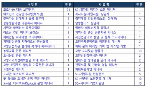 2021년 1월 ‘코로나19 대응 보건인력’의 참여자 21명 모집을 시작으로 각 사업별로 공개 채용이 진행될 예정이다. 참여를 원하는 신중년은 고양시청 홈페이지 채용공고에서 확인하면 된다.