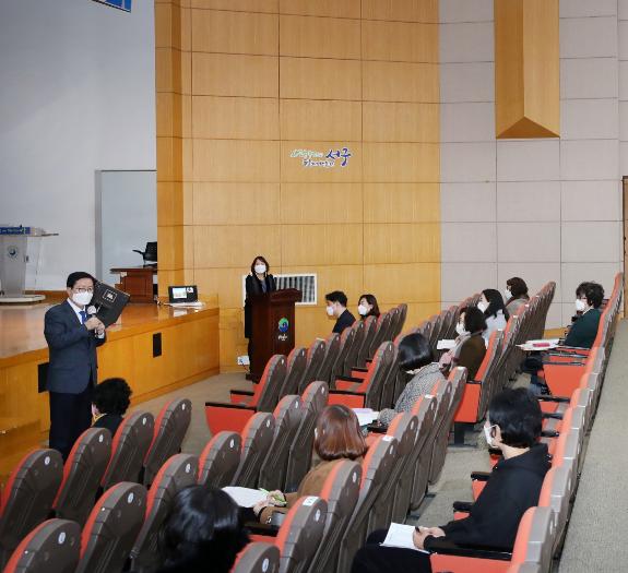 대전 서구는 29일 청사 구봉산홀에서 2021년 지역아동센터 파견 지원사업으로 신규 채용된 아동복지 교사(기간제) 26명을 대상으로 직무교육을 했다.