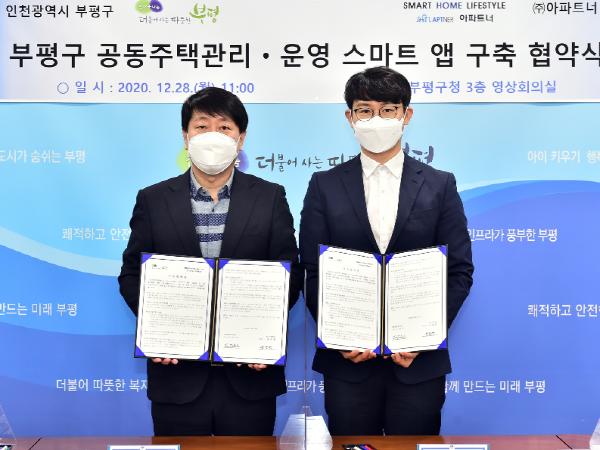 부평구는 지난 28일 구청 영상회의실에서 ㈜아파트너와 코로나19 확산 예방을 위해 공동주택관리에서 비대면 방식을 추진하는 ‘부평구 공동주택관리·운영 스마트앱 구축 협약식’을 진행했다.