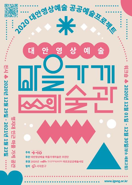 (사)대안영상문화발전소 아이공은 코로나19로 힘들고 지친 시민들에게 예술과 위로를 건네는 2020 대안영상예술 공공예술프로젝트 <마을가게 미술관>을 오는 12월 29일부터 2021년 1월 23일까지 서대문구 남가좌동 일대에서 무료로 선보인다.