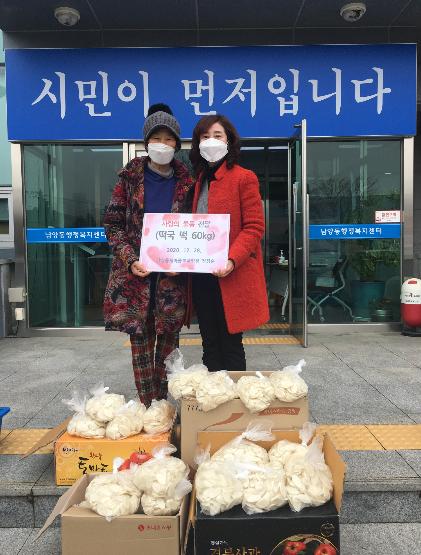 한편, 전영묘 남양동장은 평소 시정발전과 새마을 활성화 및 나눔 활동에도 몸을 아끼지 않은 정정순 회장님은 감사의 말씀을 전하며, 기탁해 주신 떡국 떡은 따뜻한 마음과 함께 독거 어르신들에게 잘 전달하여 훈훈하고 인정 넘치는 남양동이 되도록 최선을 다하겠다고 밝혔다.