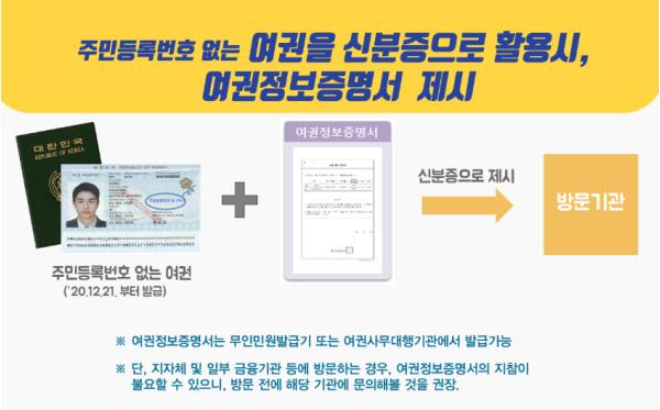국내에서 주민등록번호 뒷자리가 없는 여권을 신분증으로 사용하려면 ‘여권’과 ‘여권 정보 증명서’를 함께 제출해야 한다.
