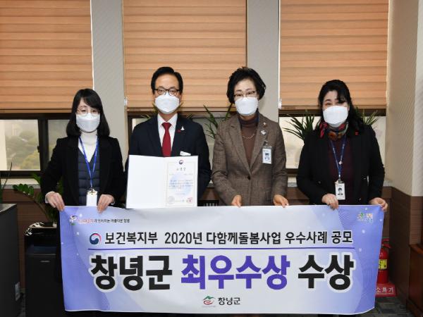 이번 공모는 보건복지부와 아동권리보장원에서 다함께돌봄사업의 긍정적인 우수사례를 발굴하고 전파하기 위해 올해 처음 실시했으며, 창녕군은 전국 지자체 중 군 지역에서 유일, 경남지역에서 유일하게 우수설치·운영분야에서 최우수상에 선정되어 보건복지부장관 표창을 수상했다.