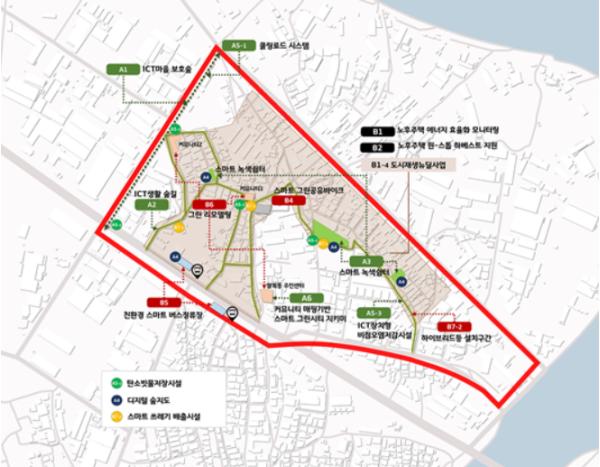 녹색 탄소 ICT 마을숲 조성사업은 산업단지와 주거지 사이 산업용 도로 395m 구간에 녹화벽(ICT 완충숲)을 설치해 도로와 산업단지에서 날아오는 비산먼지 등 오염물질을 차단하는 사업을 포함해 △ICT 생활숲길 조성 △스마트 녹색쉼터 구축 △디지털 숲지도 구축 △빗물활용 자동살수시스템 운영 등이 추진된다.