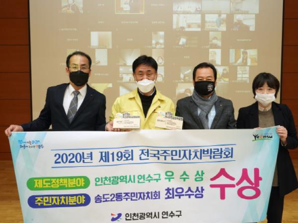 연수구는 인천 최초로 14개 모든 동의 주민자치회 전환과, 주민자치사업단 직영체제 운영, 비대면 온라인 주민총회 개최 등으로 높은 평가를 받았고 송도2동 주민자치회는 생활 속 주민참여 확대와 평생학습을 매개로한 지속발전 가능한 마을공동체 활성화 성과 등이 인정 받았다.