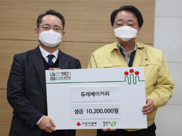 듀레베이커리(대표 전호영)가 29일 오전 10시 시청 직지실에서 충북 사회복지공동모금회 희망2021 나눔캠페인을 통해 성금 1000만 원을 청주시에 기탁했다.