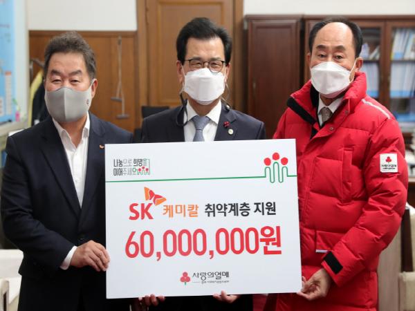 SK케미칼은 불우이웃돕기 성금으로 충북사회복지공동모금회에 6천만원, 장학금으로 충북인재양성재단에 4천만원 총 1억원을 쾌척했다.