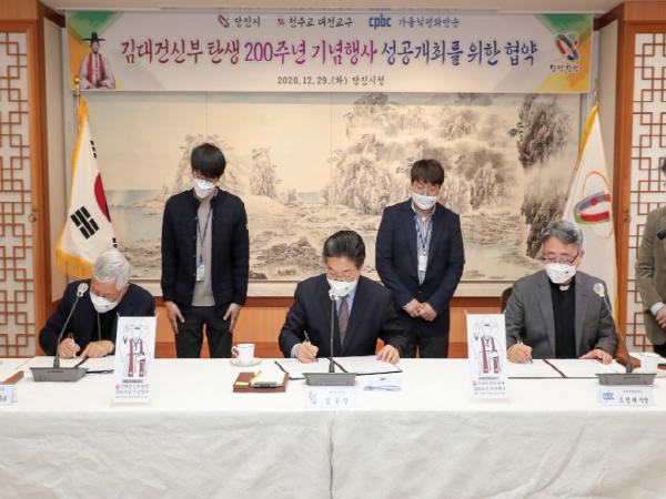 충청남도 당진시와 천주교 대전교구, 가톨릭평화방송은 지난 29일 대한민국 최초의 사제이자 유네스코 세계기념인물로 선정된 김대건 신부 탄생 200주년 기념행사 성공개최를 위한 업무 협약을 체결했다.