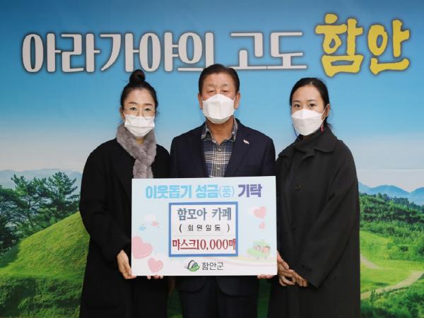 네이버 카페 함안지역 온라인 모임 함모아카페(함안 모든 아줌마들의 모임)는 지난 28일 군청을 방문하여 관내 어려운 이웃을 위해 사용해달라며 비말마스크 10,000장을 기탁했다.