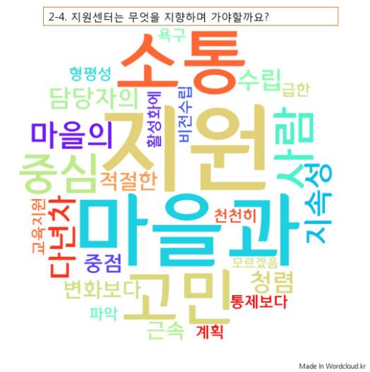 센터는 이를 통해 마을활동가의 가치와 지원 필요성, 마을공동체 지원 유형과 더불어 지원센터의‘사람과 과정’ 중심의 지원 사업 설계와 운영 역량이 필요하다는 결과를 도출했다.