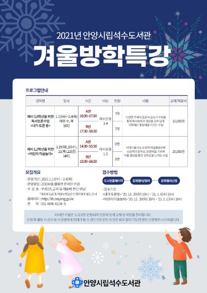 석수도서관 관계자는 “이번 겨울방학 특강을 통해 코로나19로 외부활동이 어려운 어린이들이 유익하고 활동적인 시간을 보낼 수 있기를 바란다”고 전했다.