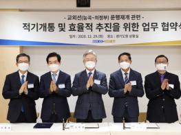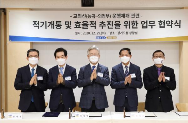 이재명 경기도지사는 29일 오전 경기도청 상황실에서 이재준 고양시장, 안병용 의정부시장, 조학수 양주부시장과 이 같은 내용의 ‘교외선 운행재개 적기개통 및 효율적 추진을 위한 업무협약’을 체결했다.