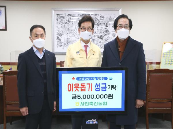 사천축산농협(조합장 진삼성)은 12월 29일, 사천시청을 방문해 관내 어려운 이웃을 위한 이웃돕기 성금 500만 원을 전달했다.