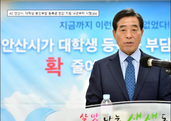 안산시(시장 윤화섭)는 지역사회 인재 육성 강화 등을 위해 전국 시 단위로는 처음으로 도입한 ‘대학생 본인부담 등록금 반값 지원’사업을 내년 1학기부터 본격적으로 시행한다고 8일 밝혔다.