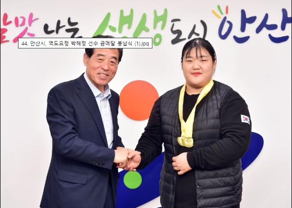 안산시(시장 윤화섭)는 지난 5일 시장실에서 '아시아 유소년·주니어 역도선수권 대회’에서 우수한 성적으로 안산시를 빛낸 박혜정(16·선부중) 선수의 메달 봉납식을 열었다고 8일 밝혔다.
