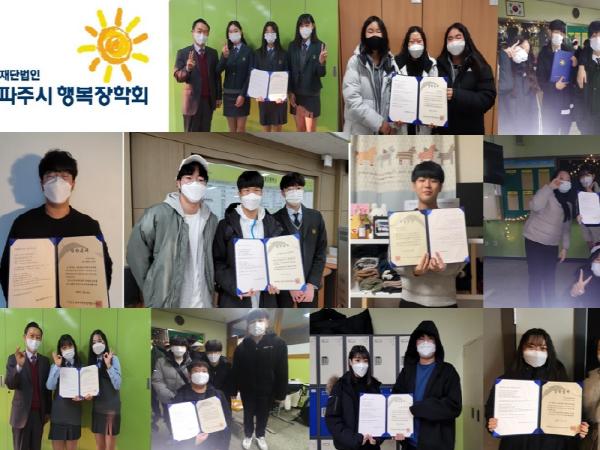 또한 영상부문 최우수상을 수상한 문산수억고등학교 김승은, 김채령, 송윤서, 한예빈 팀은 “코로나19로 학교도 못 가고 친구들과 함께 하지 못해 아쉬움이 컸는데 파주시행복장학회 공모전 참여로 친구들과의 정을 돈독히 쌓을 수 있는 의미 있고 행복한 시간이었다”라고 말했다.