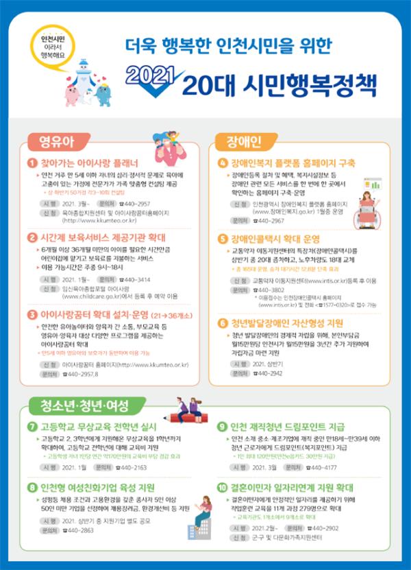 인천시는 내년부터 시행되는 사업·제도·시설 등 정책정보를 7개 분야 85개 세부정책으로 정리한 ‘2021년 인천시민의 생활이 이렇게 달라집니다’ 책자를 발간한다고 30일 밝혔다. <붙임1>