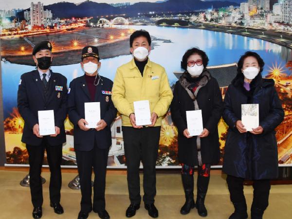 이날 자서전 책 전달식은 코로나19로 인해 출판기념회를 축소함에 따라 박태완 중구청장과 월남전 참전자 안평영 씨, 독립유공자 이인규 씨의 자녀 이경자 씨, 옥골시장 상인 이풍임 씨 등 각 분야의 대표 3명과 월남전 참전자회 중부지회장인 김기석 회장만 참석했다.