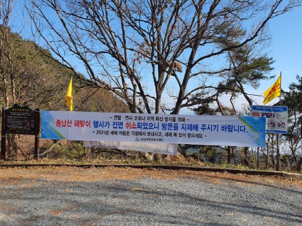 이에 따라 시는 종남산, 추화산, 만어산, 당말리 공원, 천왕재, 용궁사 등 해맞이 명소 내 주요 지점에 입산 자제 및 행사취소 현수막을 게시하고, 읍?면?동별로 마을방송 및 이?통장을 통해 적극적인 홍보를 펼치고 있다.