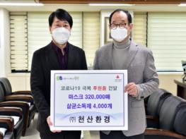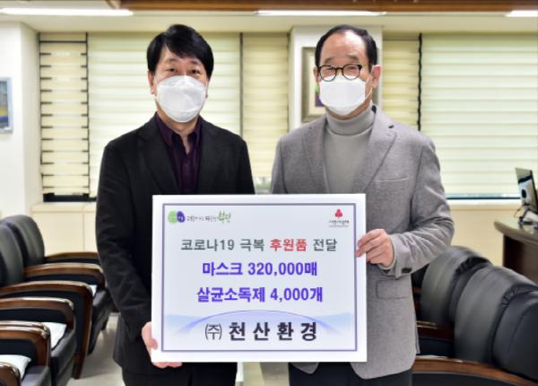 전달식에 참석한 ㈜천산환경 김건영 대표는 “부평구의 코로나19 감염예방과 방역에 보탬이 되고자 덴탈마스크와 살균소독제를 전달하기로 했다”며 “앞으로도 지역사회 발전을 위해 나눔 활동을 이어가는 기업이 되겠다”고 말했다.