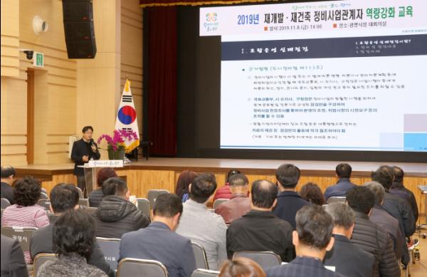 광명시(시장 박승원)는 8일 시청 대회의실에서 재개발·재건축 정비사업 조합임원, 정비업체 등 정비사업 관계자 50여명이 참석한 가운데 ‘정비사업 관계자 역량강화교육’을 실시했다.
