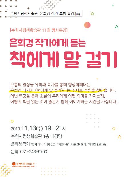 수원시평생학습관이 11월 13일 저녁 7시 평생학습관 1층 대강당에서 은희경 작가를 초청해 명사 특강을 연다.