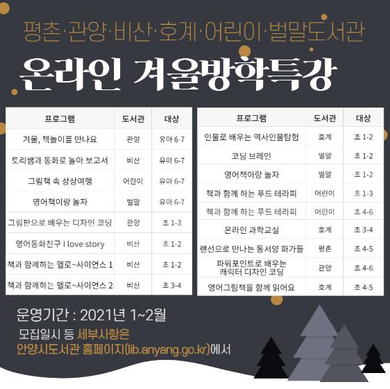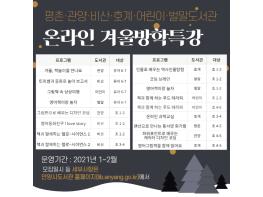 안양시 동안구에 소재한 6개 시립도서관(평촌ㆍ관양ㆍ비산ㆍ호계ㆍ어린이ㆍ벌말도서관)이 방학을 맞이한 어린이를 위해 2021년 온라인 겨울방학 특강을 운영한다.
