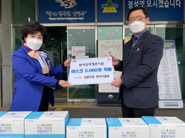양평로얄 로타리클럽(회장 배귀호, 초대회장 김정옥)에서는 지난 29일 양평읍사무소에 복지취약계층의 코로나 예방을 위한 마스크 5,000장을 기부했다.