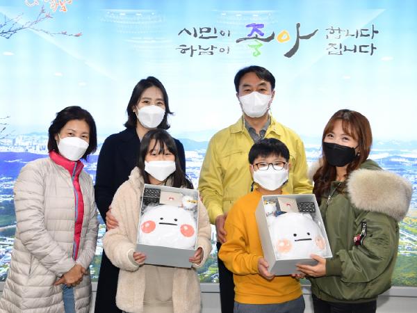 김상호 하남시장은 지난 29일 시장실에서‘지하철 역사 활성화 프로젝트’로고 디자인을 제작한 시민예술가 임숙자 씨와 신평초등학교 손지우, 서예진 학생을 초청해 감사의 뜻을 전했다.