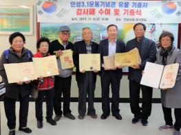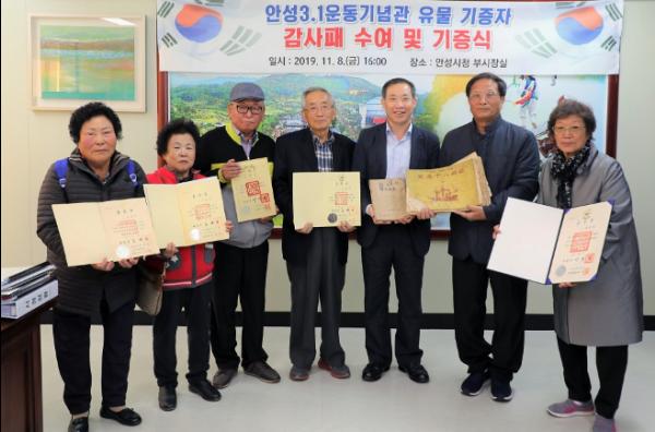 안성시는 지난 8일 안성시청 부시장실에서 안성3.1운동기념관 유물 기증자 5명에 대한 감사패 수여 및 유물 기증식을 진행했다.