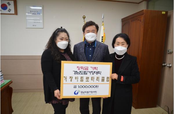 경남도립거창대학(총장 박유동)은 지난 29일 거창아림로타리클럽(회장 곽순남)에서 장학금 100만원을 기탁했다고 밝혔다.