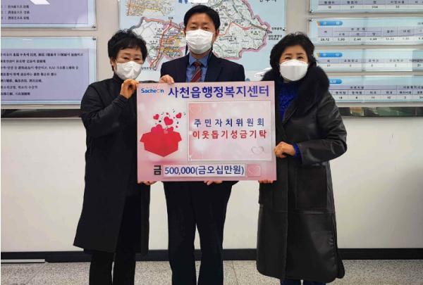사천읍주민자치위원회(위원장 김외규)는 12월 30일 사천읍행정복지센터에서 독거노인 및 소외계층을 위해 경남 사회복지공동모금회에 성금 50만원을 기탁했다.
